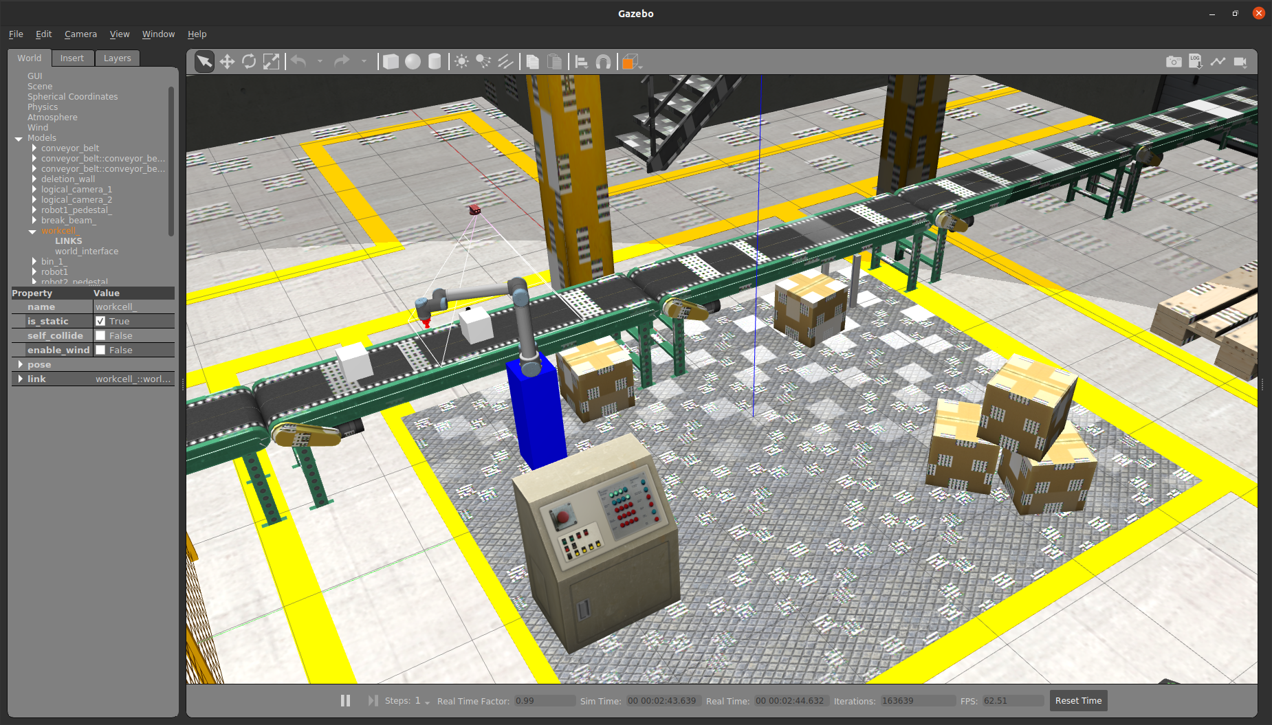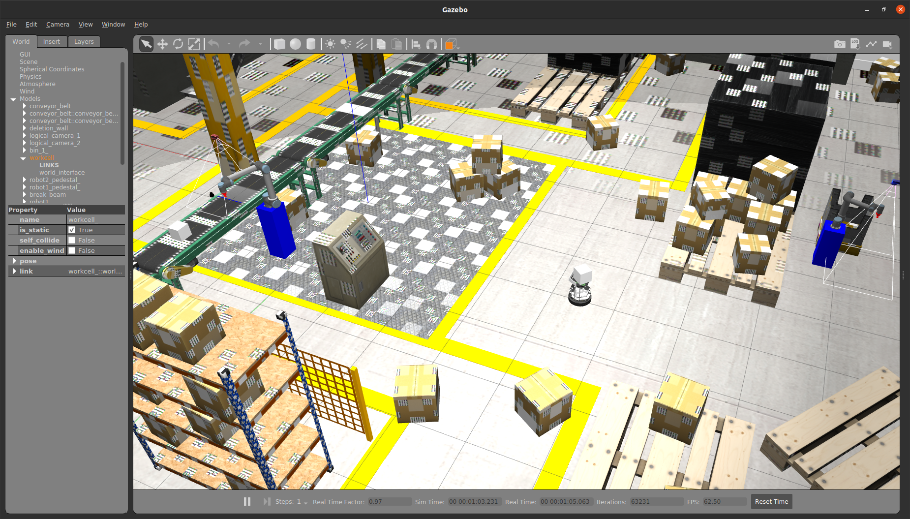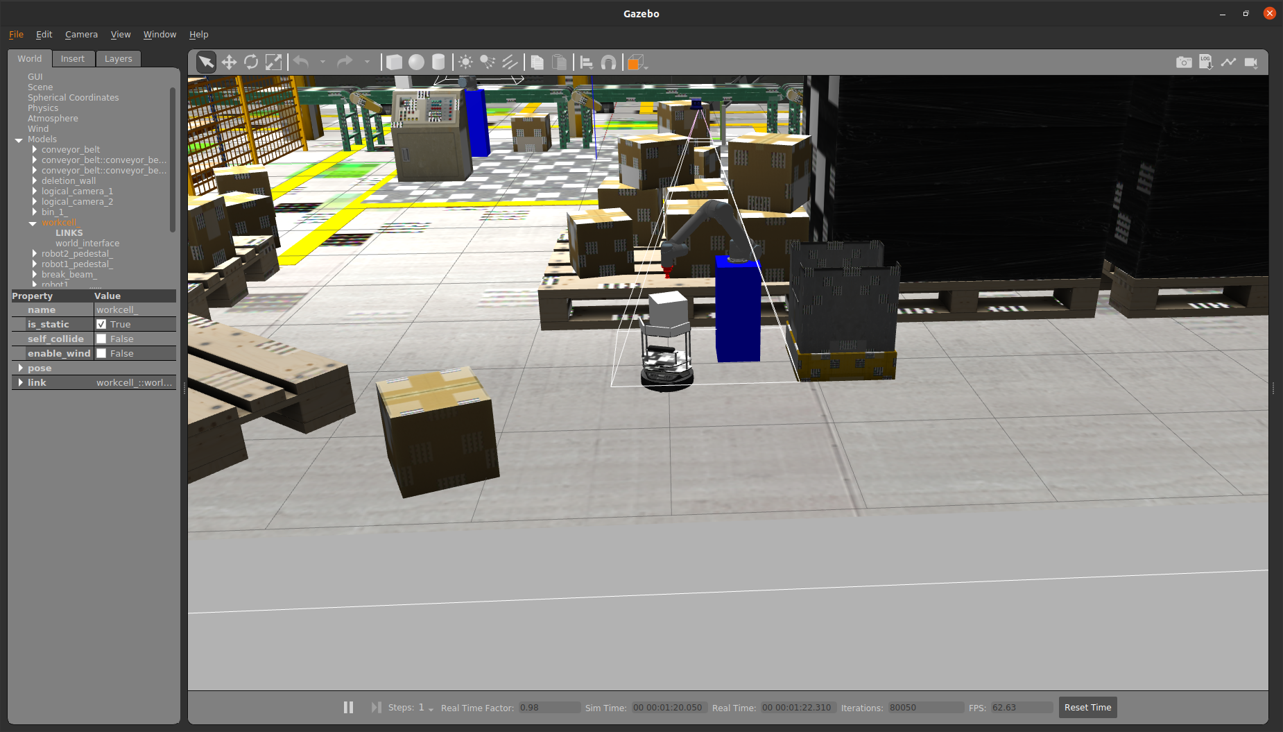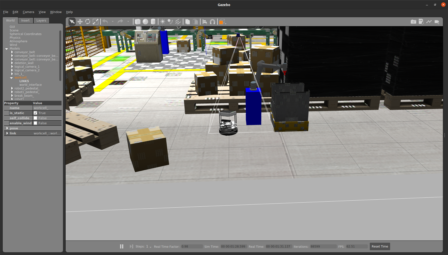 Simulated control architecture and system state design for Motion Planning of UR5 6DOF Manipulator in ROS Gazebo for vision based smart part picking on a conveyor belt, and autonomous navigation of TurtleBot on factory floor with LiDAR point cloud maps.